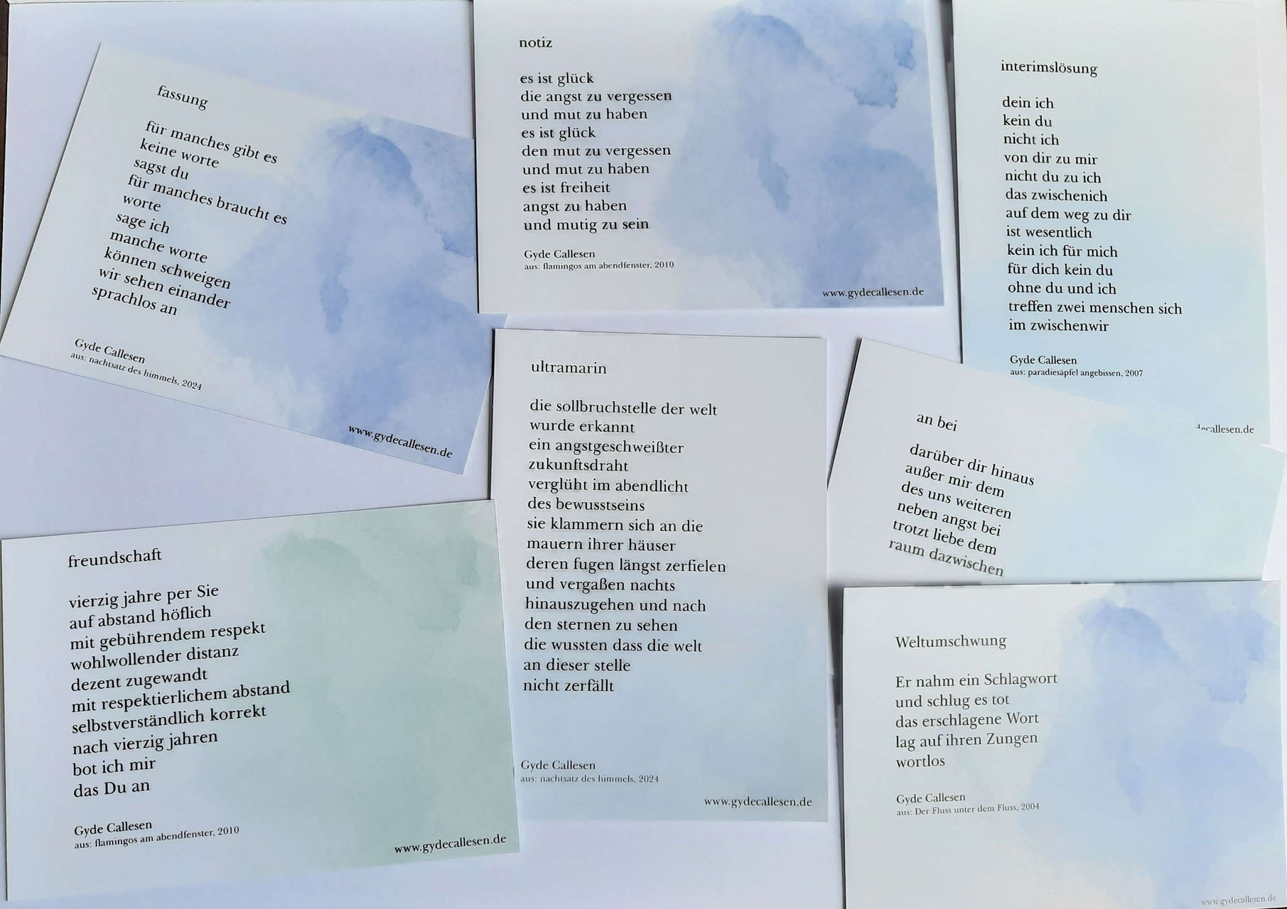 Schön gestaltete Postkarten mit ausgewählten Gedichten von Gyde Callesen aus dem lyrischen Werk - von heiter bis nachdenklich....